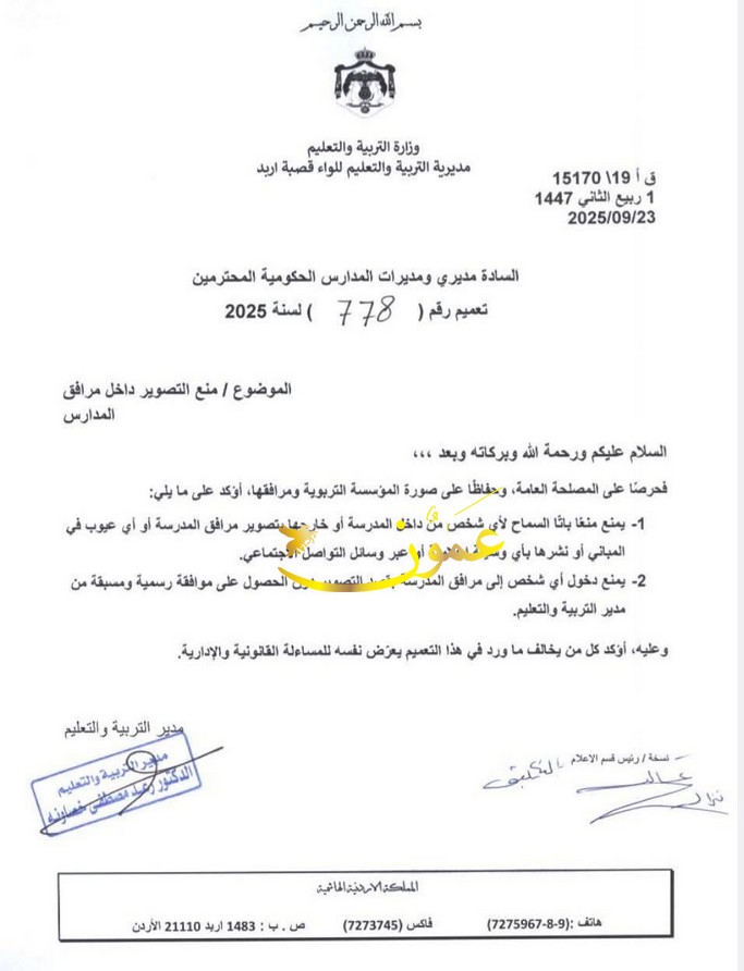 مدير تربية قصبة إربد يمنع تصوير عيوب المدارس ونشرها24-09-2025 05:33 PM