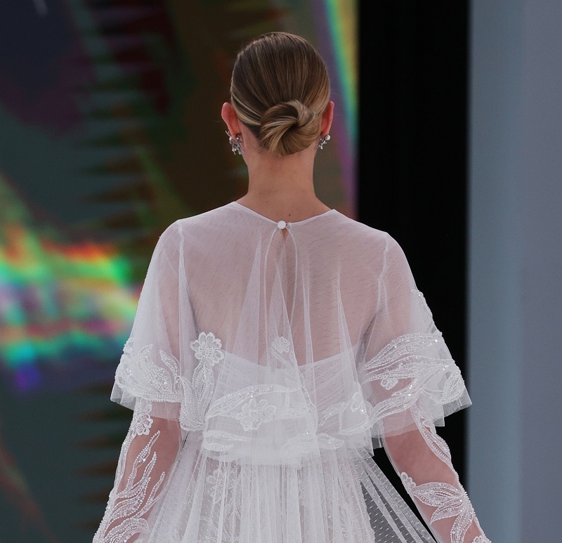 للعروس الحالمة التي تبحث عن تسريحة عصرية ولافتة، حيث يظل الشعر ثابتاً وأنيقاً طوال اليوم، فإن تسريحة ذيل الحصان المزدانة بطرحة من الدانتيل المخرم، التي برزت في عرض دار سيمبلين خلال أسبوع الموضة في برشلونة، ستكون خياراً مثالياً لها. هذه التسريحة اعتمدت على جمع الشعر إلى الخلف بأسلوب ناعم وأنيق، ثم تزيينه بطرحة شفافة غنية بالتفاصيل الدقيقة، التي انساب منها الدانتيل المخرّم؛ ليمنح العروس لمسة شاعرية ساحرة.