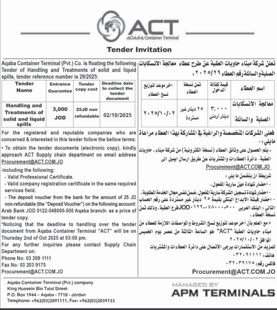 عطاء صادر عن شركة ميناء حاويات العقبة