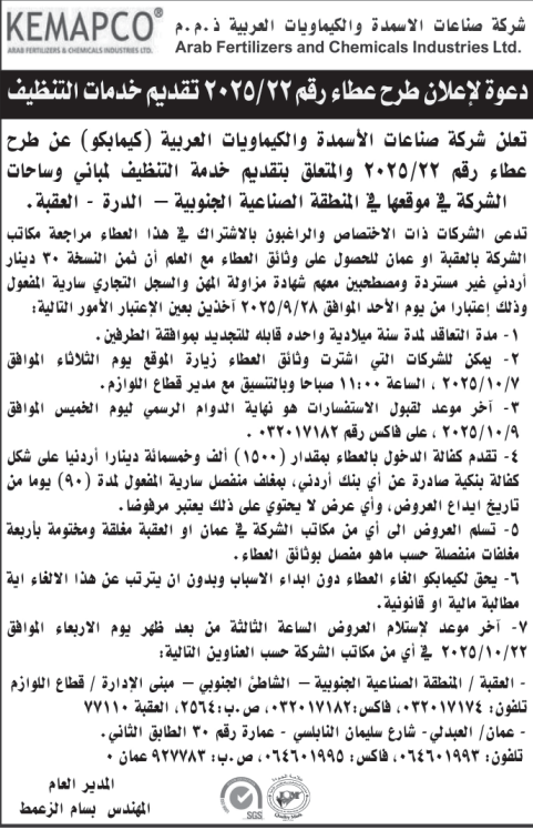 عطاء شراء خدمات التنظيف لشركة صناعات الاسمدة والكيماويات العربية