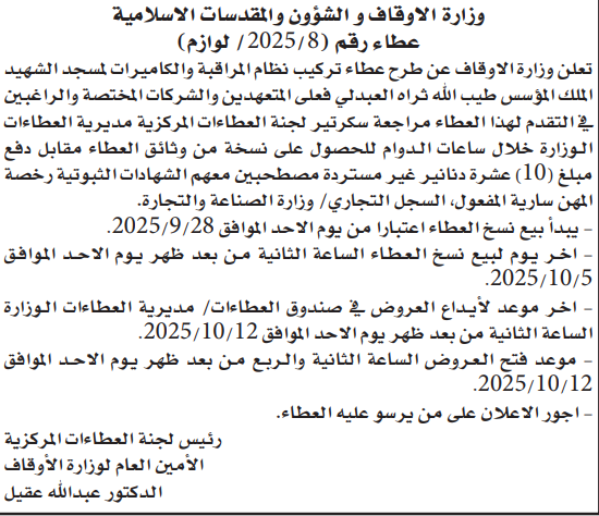 عطاء شراء تركيب نظام المراقبة والكاميرات لوزارة الاوقاف والشؤون والمقدسات الاسلامية