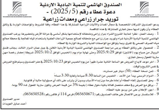 عطاء شراء جرار زراعي ومعدات زراعية لصندوق الهاشمي لتنمية البادية