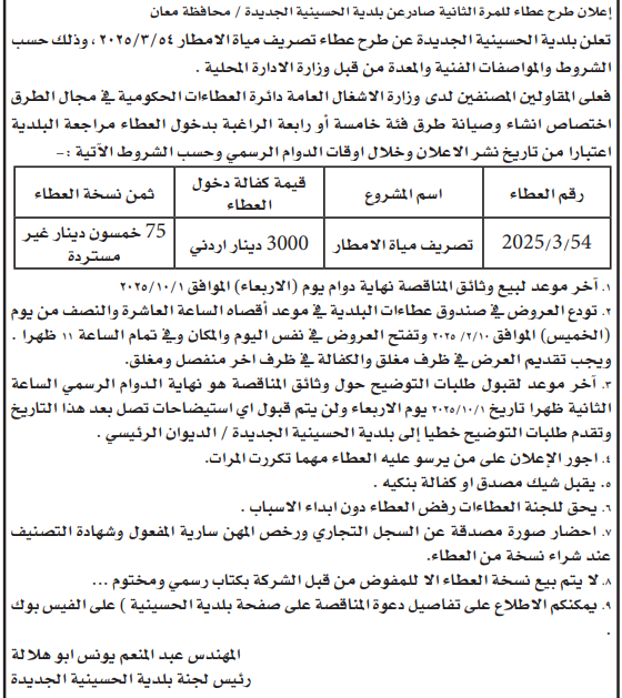 عطاء تصريف مياه الامطار لبلدية الحسينية