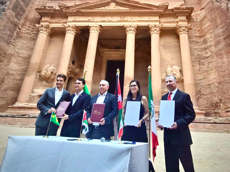 عمون - شهدت واجهة الخزنة في مدينة البترا، إحدى عجائب الدنيا السبع الجديدة، مراسم توقيع اتفاقيات تعاون دولية بين البترا وتمثال المسيح الفادي في ريو دي جانيرو بالبرازيل، وتشيتشن إيتزا في المكسيك، وذلك ضمن فعاليات يوم السياحة العالمي وقمة عجائب الدنيا السبع الجديدة التي استمرت ثلاثة أيام.