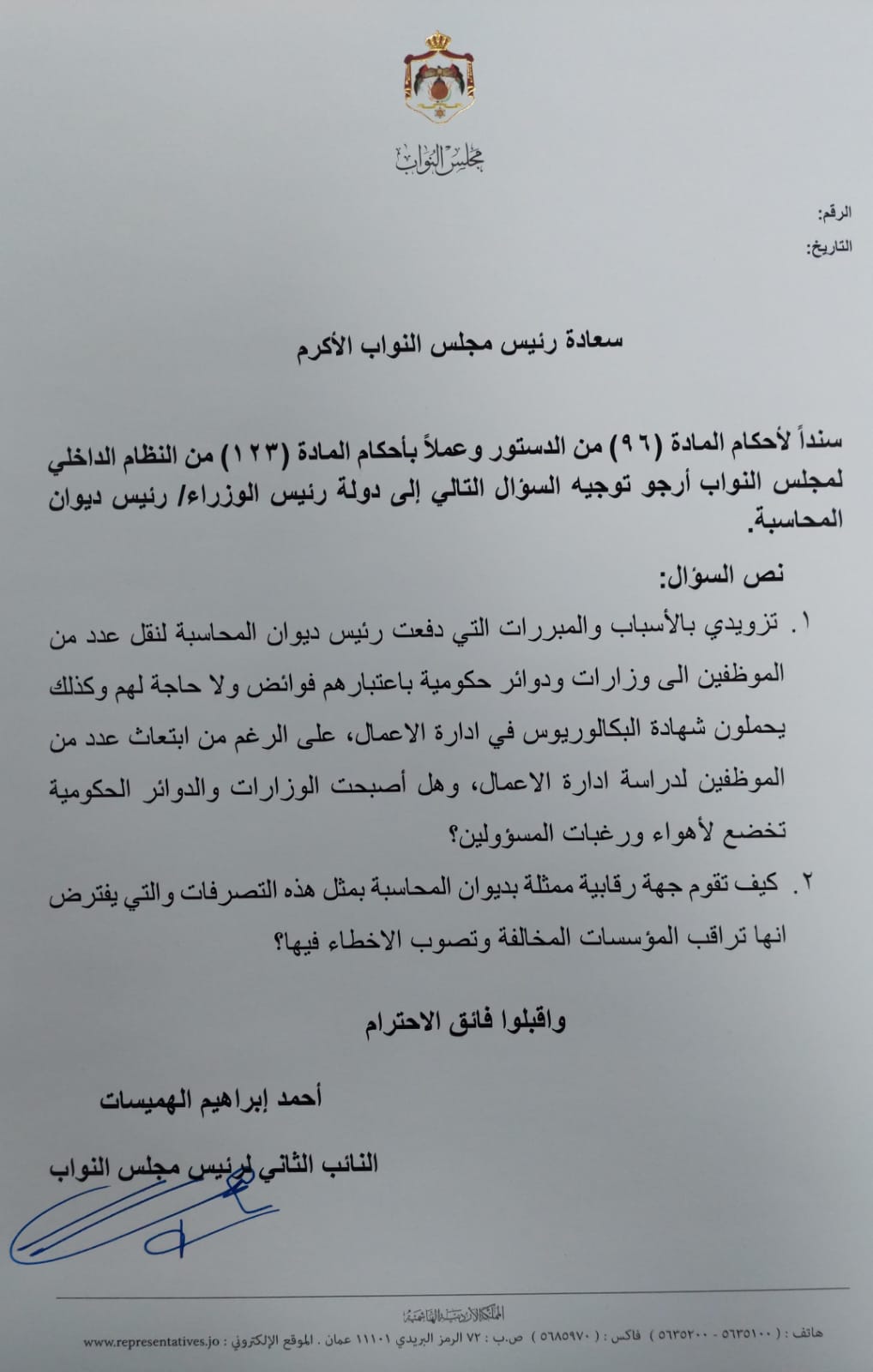 الهميسات يسأل عن ديوان المحاسبة: توظيفات بلا حاجة28-09-2025 12:13 PM