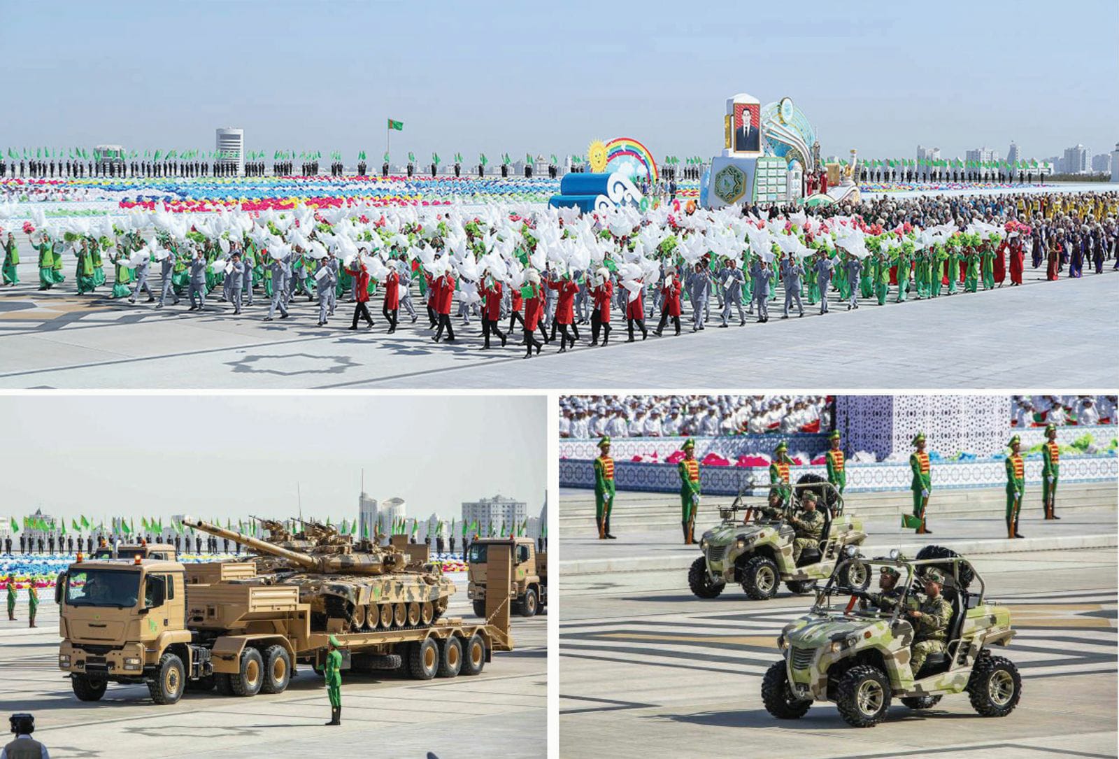 ومن المشاهد الملفتة للنظر هو اصطحاب فارسان يرتديان الزي الوطني حصانًا رائعًا من نوع "أخال تيكي" ذو المكانة التاريخية والتراثية لدى التركمان إلى الساحة، ثم انطلقت مواكب السيارات المزينة بأسلوب احتفالي، كاشفةً عن إنجازات ونجاحات مختلف قطاعات الاقتصاد الوطني في بلدنا، واحدة تلو الأخرى، وكان هذا الموكب المهيب دليلاً آخر على إنجازات تركمانستان الاقتصادية والتنموية والاجتماعية.