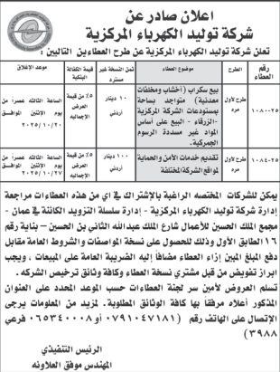 عطاءات صادرة عن شركة توليد الكهرباء المركزية