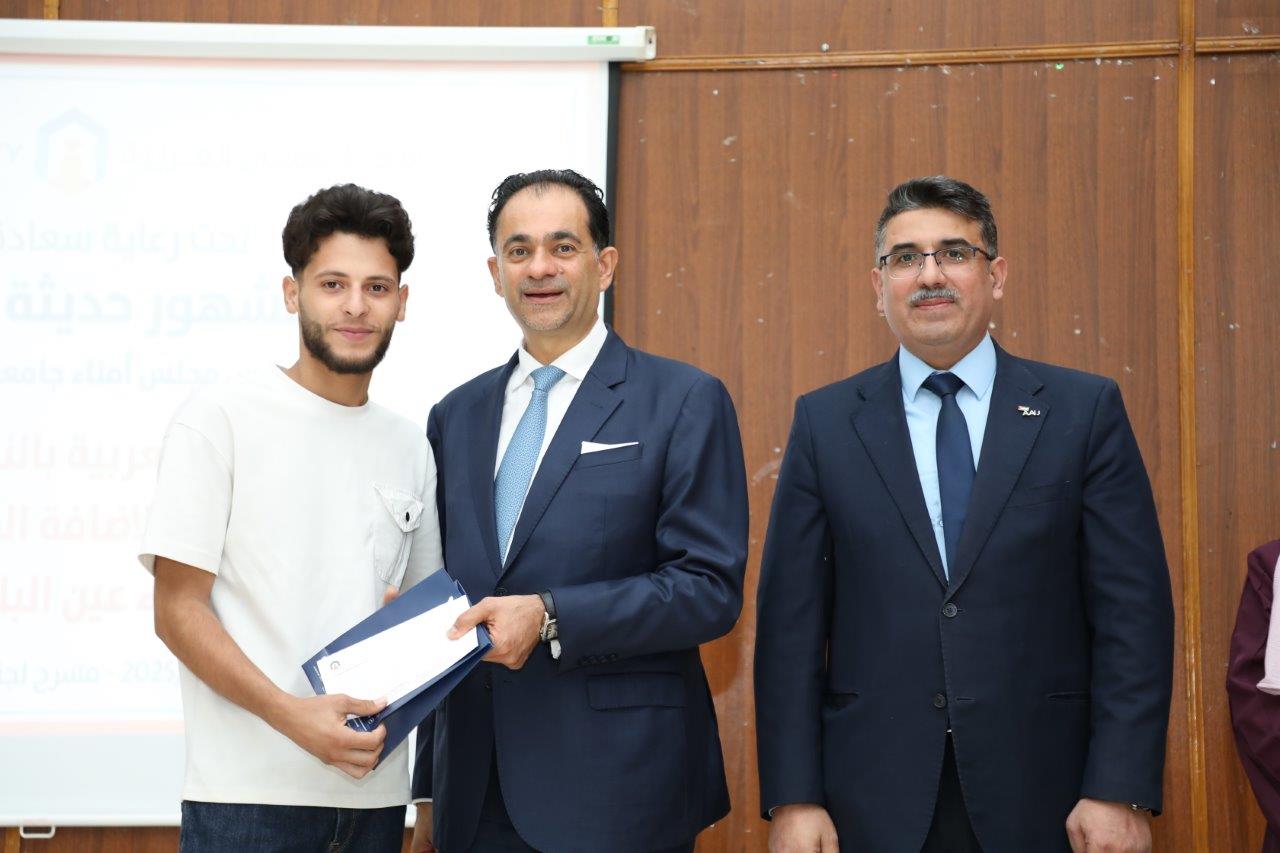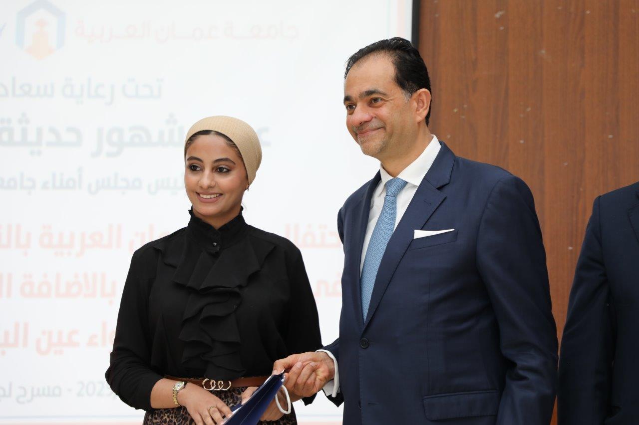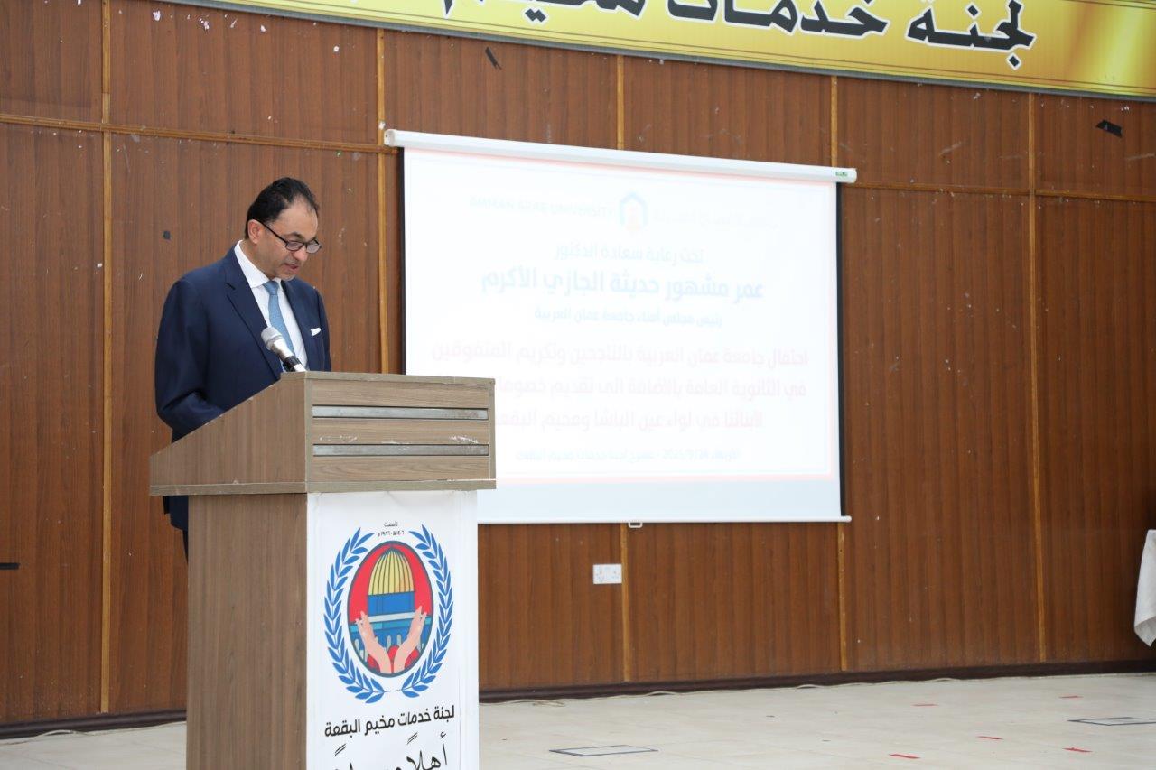 عمون - تعزيزاً لجسور التعاون مع المجتمع المحلي وبرعاية رئيس مجلس أمناء جامعة عمان العربية الدكتور عمر مشهور حديثه الجازي، نظمت جامعة عمان العربية احتفالاً لتكريم الطلبة المتفوقين بالثانوية العامة في لواء عين الباشا ومخيم البقعة بحضور الأستاذ الدكتور حسام الحمد نائب الرئيس للتخطيط وضمان الجودة مندوباً عن الأستاذ الدكتور محمد الوديان رئيس الجامعة، وعدد من عمداء الكليات ومدراء الوحدات الإدارية وعدد من وجهاء المنطقة وحشد من أهالي الطلبة وذويهم، وبتنسيق من الدكتورة باسمة أبو جابر من مكتب التربية العملية والابداع وخدمة المجتمع في جامعة عمان العربية.