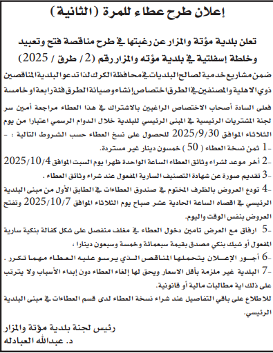 عطاء فتح وتعبيد وخلطة اسفلتية لشوارع بلدية مؤتة والمزار