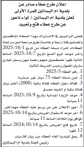عطاء فتح وتعبيد شوارع لبلدية ام البساتين