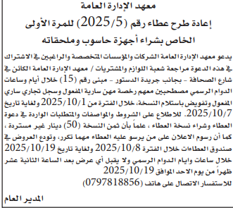 عطاء شراء اجهزة حاسوب وملحقاته لمعهد الادارة العامة