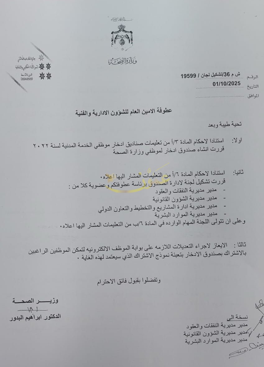 عمون - قرر وزير الصحة الدكتور إبراهيم البدور إنشاء صندوق إدخار لموظفي الوزارة، استنادا لاحكام المادة ١/٣ من تعليمات صناديق إدخار موظفي الخدمة المدنية لسنة ٢٠٢٢.