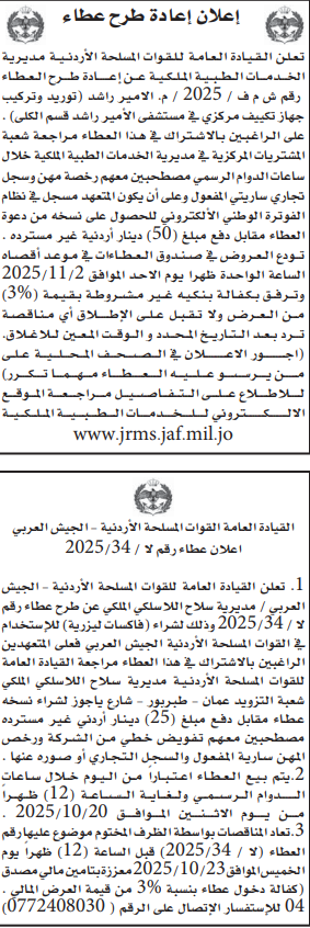 عطاءات صادرة عن القيادة العامة للقوات المسلحة الاردنية
