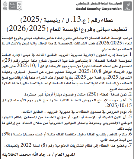 عطاء صادر عن المؤسسة العامة للضمان الاجتماعي