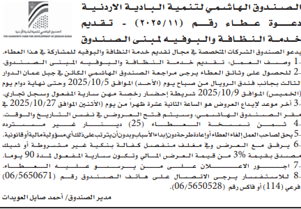 عطاء شراء خدمات التنظيف لمبنى الصندوق الهاشمي لتنمية البادية الاردنية