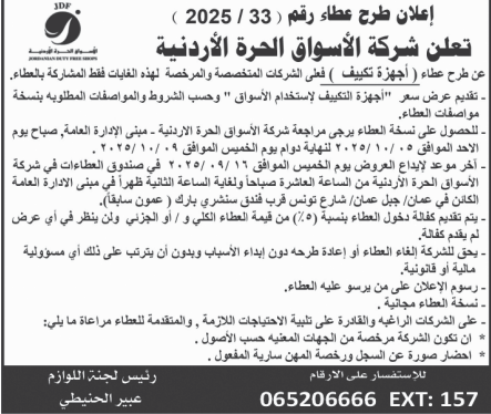 عطاء شراء اجهزة تكييف لشركة الاسواق الحرة الاردنية