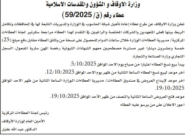 عطاء صادر عن وزارة الاوقاف والشؤون والمقدسات الاسلامية