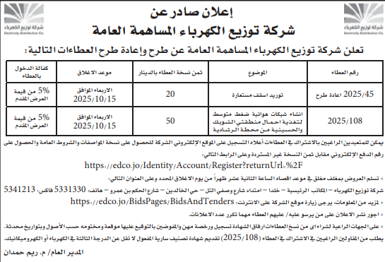 عطاءات صادرة عن شركة توزيع الكهرباء