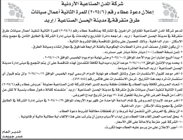 عطاء صادر عن شركة المدن الصناعية الاردنية