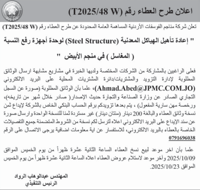 عطاء صادر عن شركة مناجم الفوسفات الاردنية