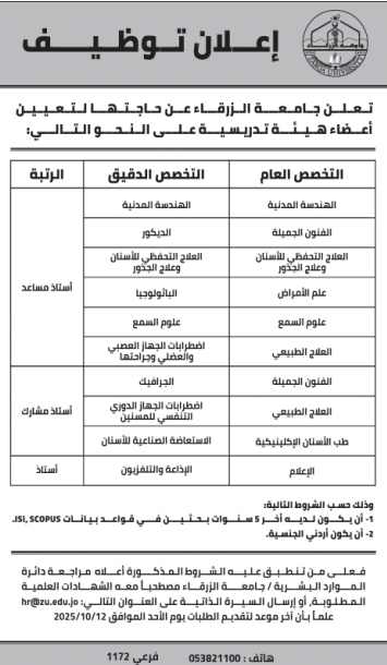 جامعة الزرقاء بحاجة لتعيين اعضاء هيئة تدريسية