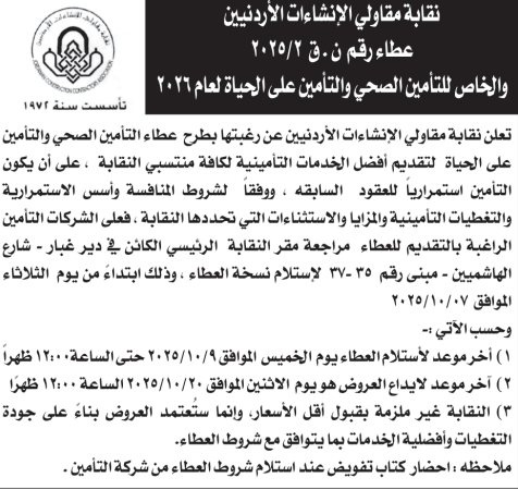 عطاء شراء خدمات التأمين الصحي لموظفي نقابة مقولي الانشاءات الاردنيين