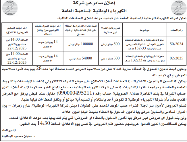 عطاءات صادرة عن شركة الكهرباء الوطنية