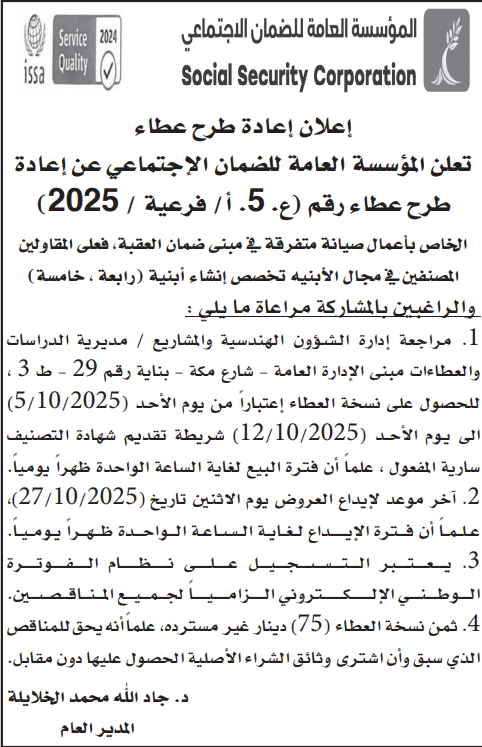 عطاء صادر عن المؤسسة العامة للضمان الاجتماعي