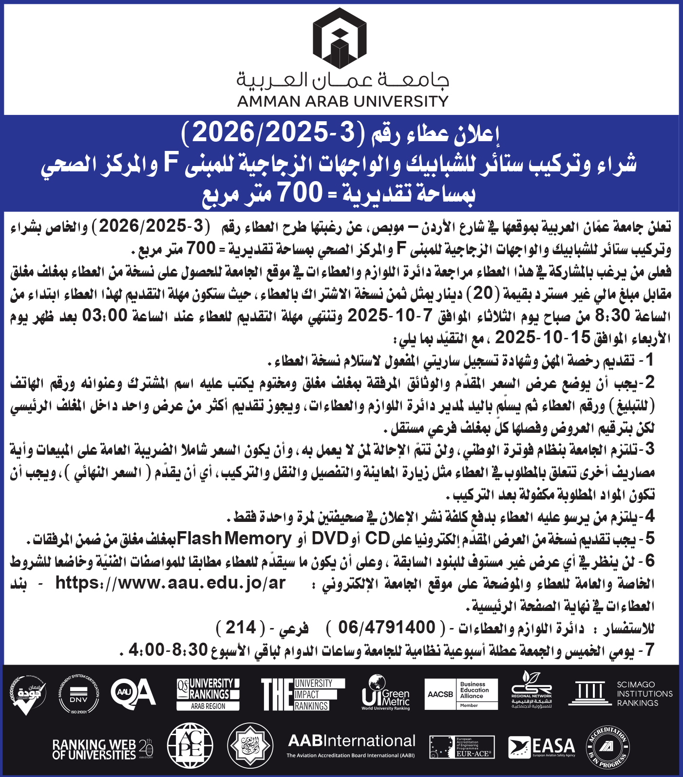 عمون- تعلن جامعة عمان العربية عن رغبتها بطرح عطاء رقم (3 - 2025/2026) شراء وتركيب ستائر للشبابيك والواجهات الزجاجية للمبنى F والمركز الصحي