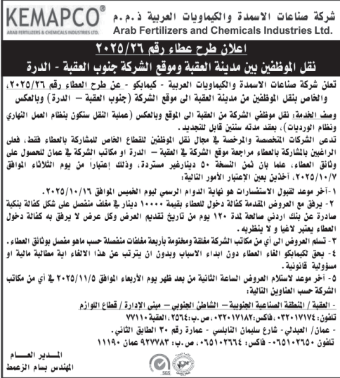 عطاء صادر عن شركة صناعات الاسمدة والكيماويات العربية