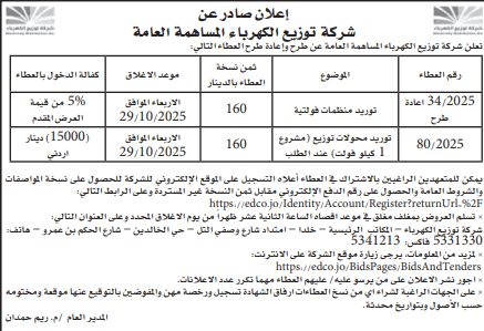 عطاءات صادرة عن شركة توزيع الكهرباء