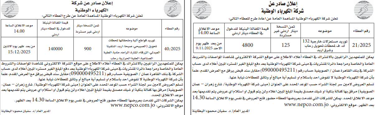عطاءات صادرة عن شركة الكهرباء الوطنية