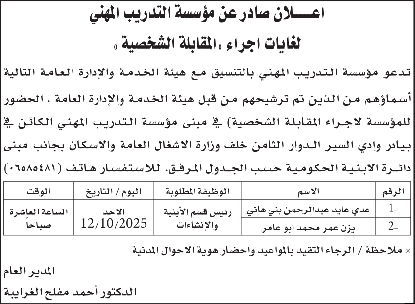 مدعوون للمقابلة الشخصية في مؤسسة التدريب المهني
