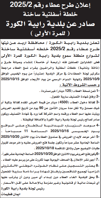 عطاء توريد خلطة اسفلتية لبلدية رابية الكورة