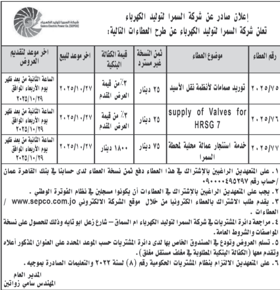 عطاءات صادرة عن شركة السمرا لتوليد الكهرباء