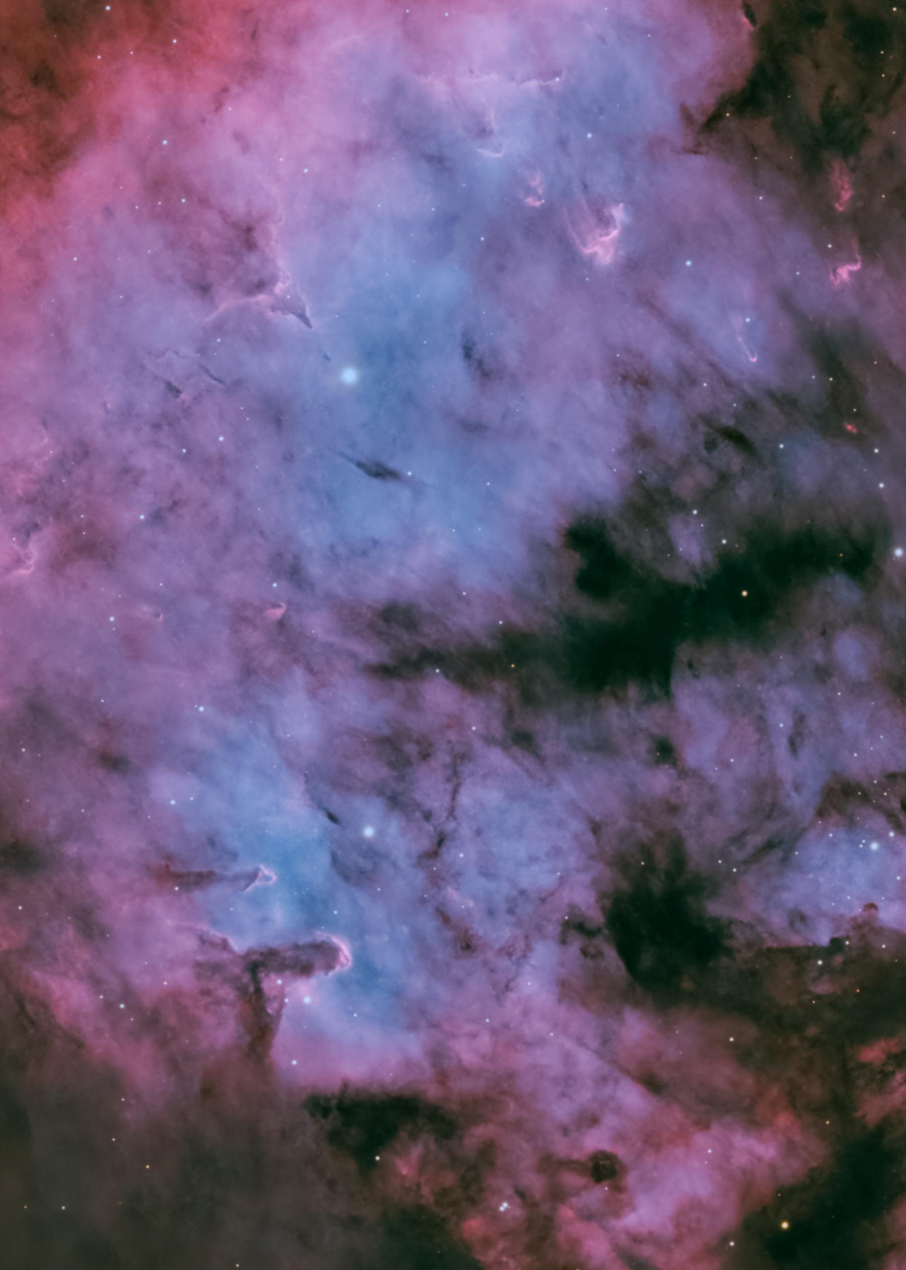 يساهم تجمع النجوم القريبة من السديم، وتحديداً هذا النجم اللامع، في تكون التشكيلات التي تظهر في الصورة، والتي يشبه بعضها "أعمدة الخلق" الشهيرة وبعضها يشبه تشكيلات سديم "خرطوم الفيل"، فضلاً عن التكتلات والبقع والتشكيلات المختلفة الظاهرة في الصورة.