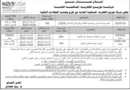 عطاءات صادرة عن شركة توزيع الكهرباء