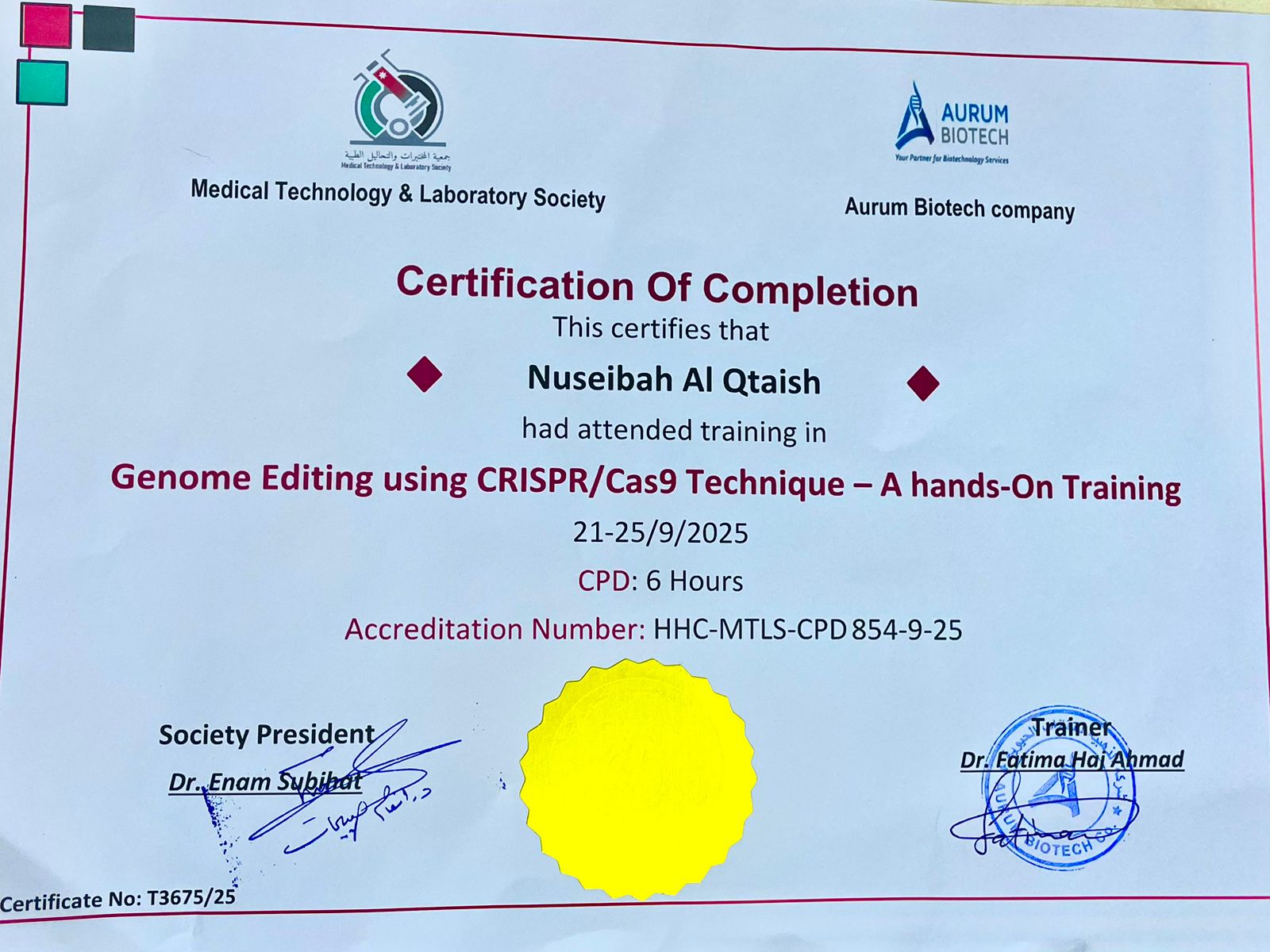 عمون - في إطار التزام جامعة عمان العربية المتواصل بدعم البحث العلمي والابتكار ، اجتازت الدكتورة نسيبة القطيش من كلية الصيدلة في جامعة عمان العربية برنامجاً تدريبياً متقدماً بعنوان: "CRISPR/Cas9 Genome Editing "، الذي نظمته مؤسسة AURUM BIOTECH بواقع (30) ساعة تدريبية شملت الجوانب النظرية والتطبيقية والبرمجية ، والذي استمر لمدة خمسة أيام تدريبية مكثفة تناولت مقدمة شاملة حول تقنية CRISPR/Cas9 وآفاقها العلمية، والتصميم الحاسوبي للبُنى الجينية، إلى جانب تطبيقات عملية في المختبر تضمنت تحضير العينات وفحصها واستخلاص البلازميد، وصولاً إلى التحقق من النتائج من خلال تقنيات التسلسل الجيني الحديثة.