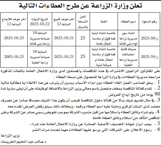 عطاءات صادرة عن وزارة الزراعة
