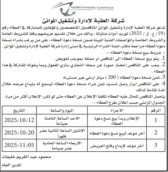 عطاء صادر عن شركة العقبة لادارة وتشغيل الموانئ