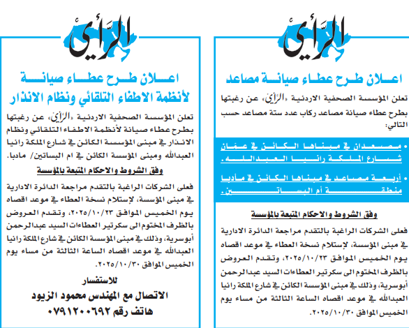 عطاءات صادرة عن المؤسسة الصحفية الاردنية "الرأي"