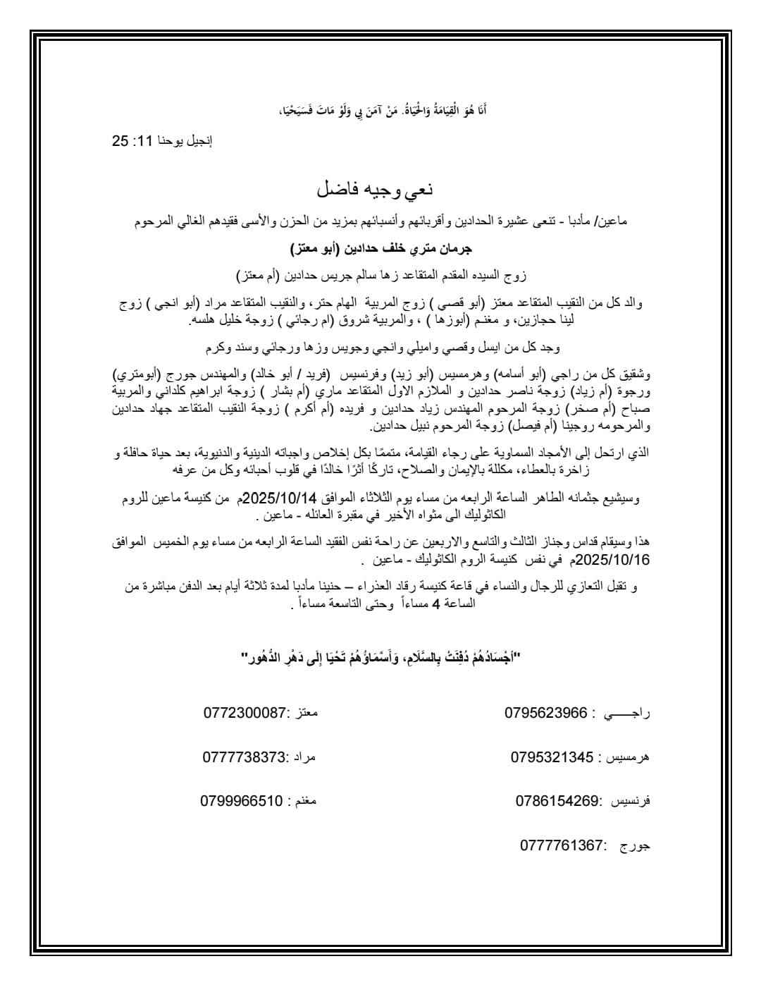 عمون - بمزيدٍ من الحزن والأسى، وبقلوب مؤمنة بقضاء الله وقدره، ينعى المحامي أكثم خلف الحدادين وزوجته تريز سالم الحدادين وابنائه الدكتور صفوت ، والاستاذة التربوية نانسي ، والقاضي العسكري الرائد صائب والمهندسة ميس ، وعائلاتهم، ابن شقيقه وعديله الغالي