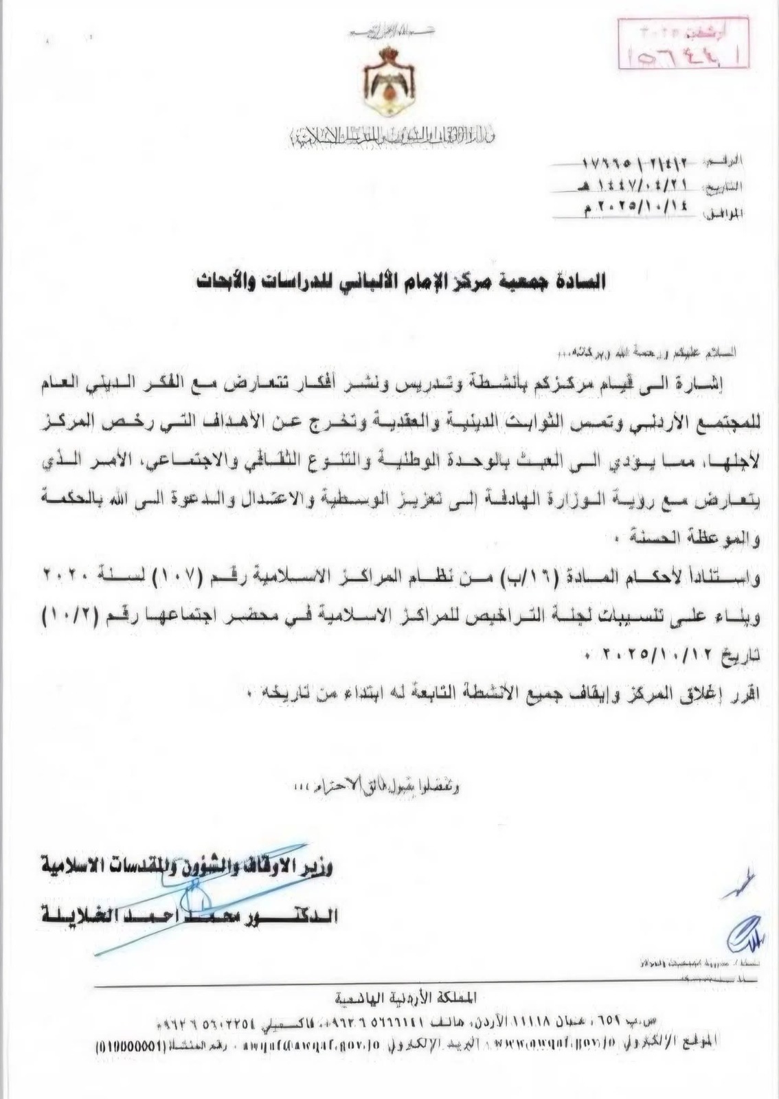 عمون - أكدت وزارة الأوقاف والشؤون والمقدسات الإسلامية، أنّ الوزير محمد الخلايلة أصدر قرارًا بإغلاق جمعية مركز الإمام الألباني للدراسات والأبحاث