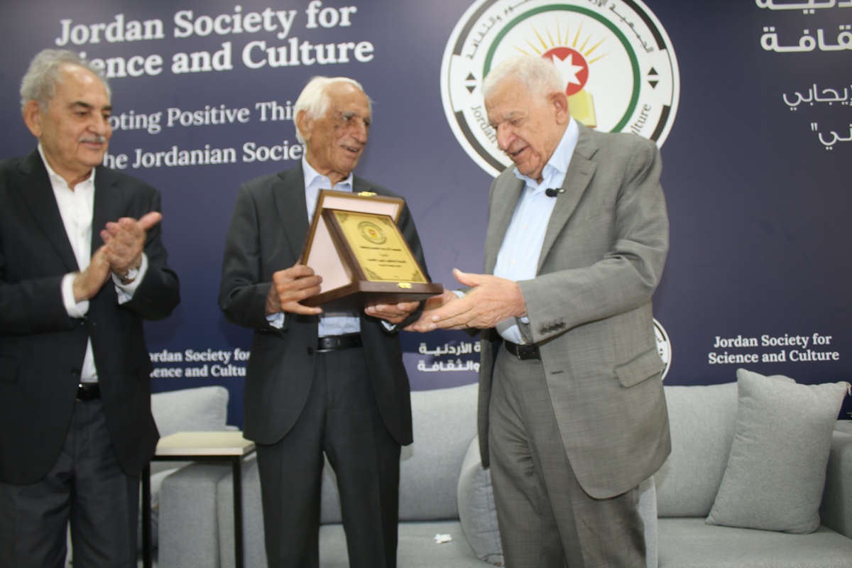 وقامت الجمعية الأردنية للعلوم والثقافة بنهاية الندوة بتكريم ضيفها د. أنيس القاسم وذلك بتسليمه درعها من المهندس عبد موسى النهار عضو الجمعية وأعضاء هيئتها الإدارية .