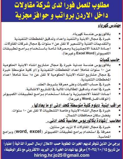 مطلوب مهندسين للعمل لدى شركة مقاولات