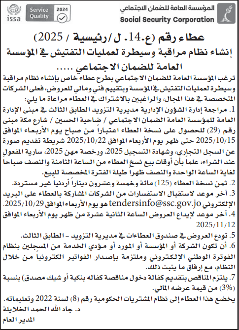 عطاء صادر عن المؤسسة العامة للضمان الاجتماعي