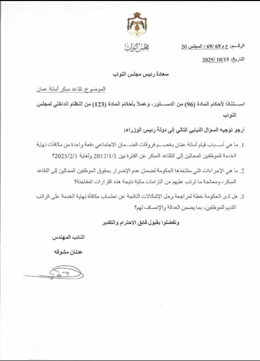 عمون - وجه النائب عدنان مشوقة سؤالًا إلى رئيس الوزراء الدكتور جعفر حسان، حول أسباب قيام أمانة عمان الكبرى بخصم فروقات الضمان الاجتماعي دفعة واحدة من مكافأة نهاية الخدمة للموظفين المحالين إلى التقاعد.