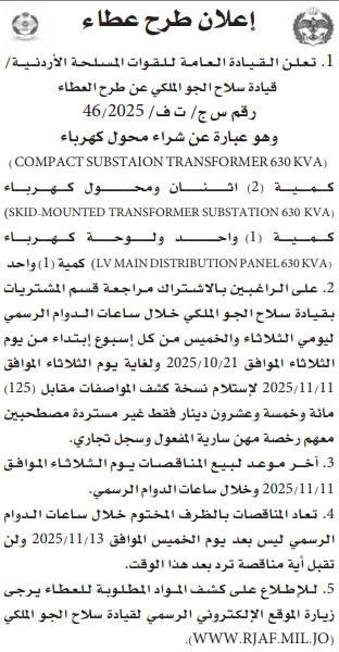 عطاء صادر عن القيادة العامة للقوات المسلحة الاردنية