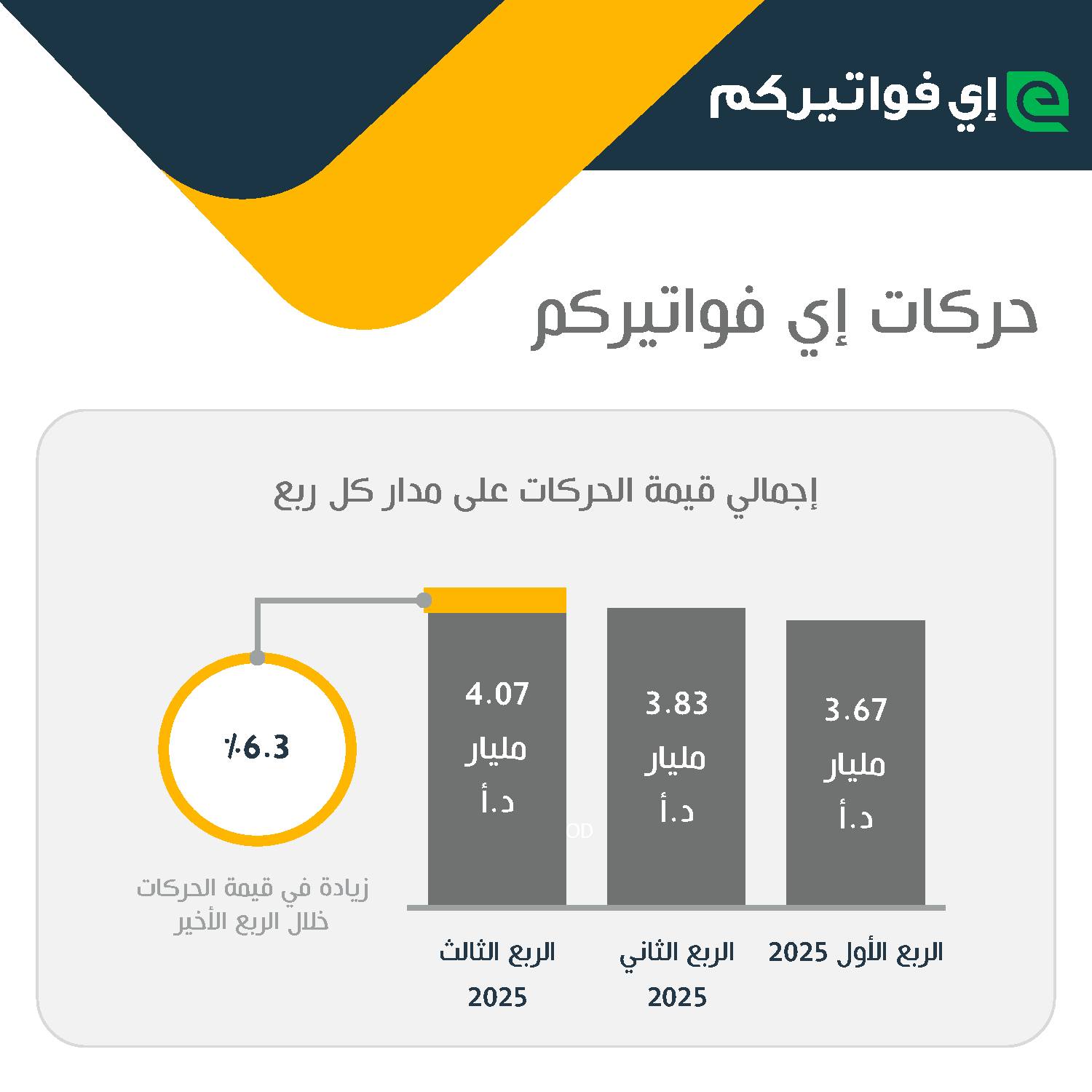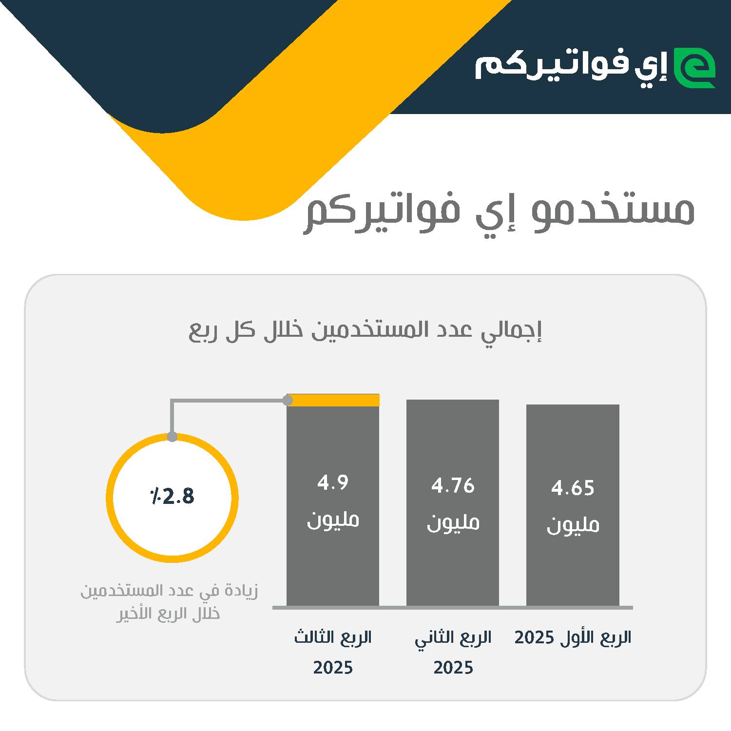 وأظهر التقرير الذي اطلعت عليه "عمون" ارتفاعاً في عدد مستخدمي "إي فواتيركم" خلال الربع الثالث بنسبة 2.8%، ليصل إلى نحو 4.9 مليون مستخدم، مقارنة بـ4.76 مليون في الربع الثاني، و4.65 مليون في الربع الأول. كما بلغ عدد الحركات المنفذة عبر النظام نحو 19.67 مليون حركة خلال الربع الثالث، بزيادة نسبتها 6.8% عن الربع السابق.