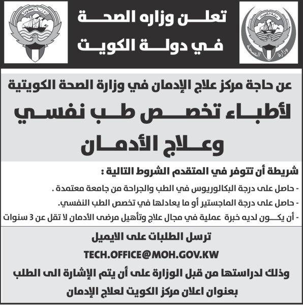 تعلن وزارة الصحة في الكويت عن حاجتها لاطباء تخصص طب نفسي